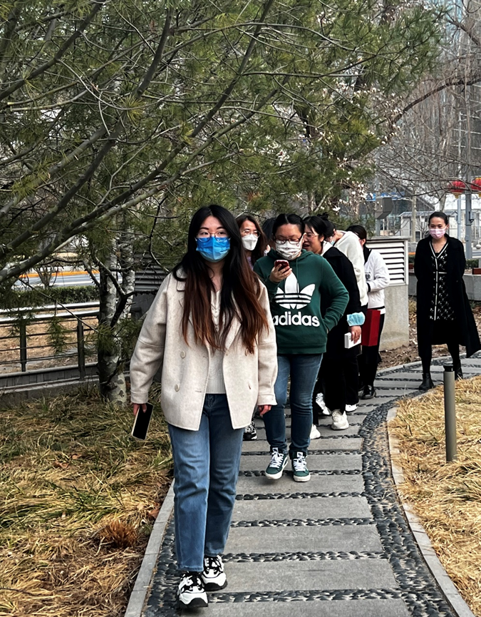 在春意盎然的景色下,參加健步走活動的員工們感受著春風的氣息和溫度,大家伸展手臂活動身體,享受著春天的美好,盡情地親近大自然。從天創東門進入中關村廣場公園西側小花園漫步一圈下來大約15分鐘的路程,不僅活動了身體,更愉悅了身心。