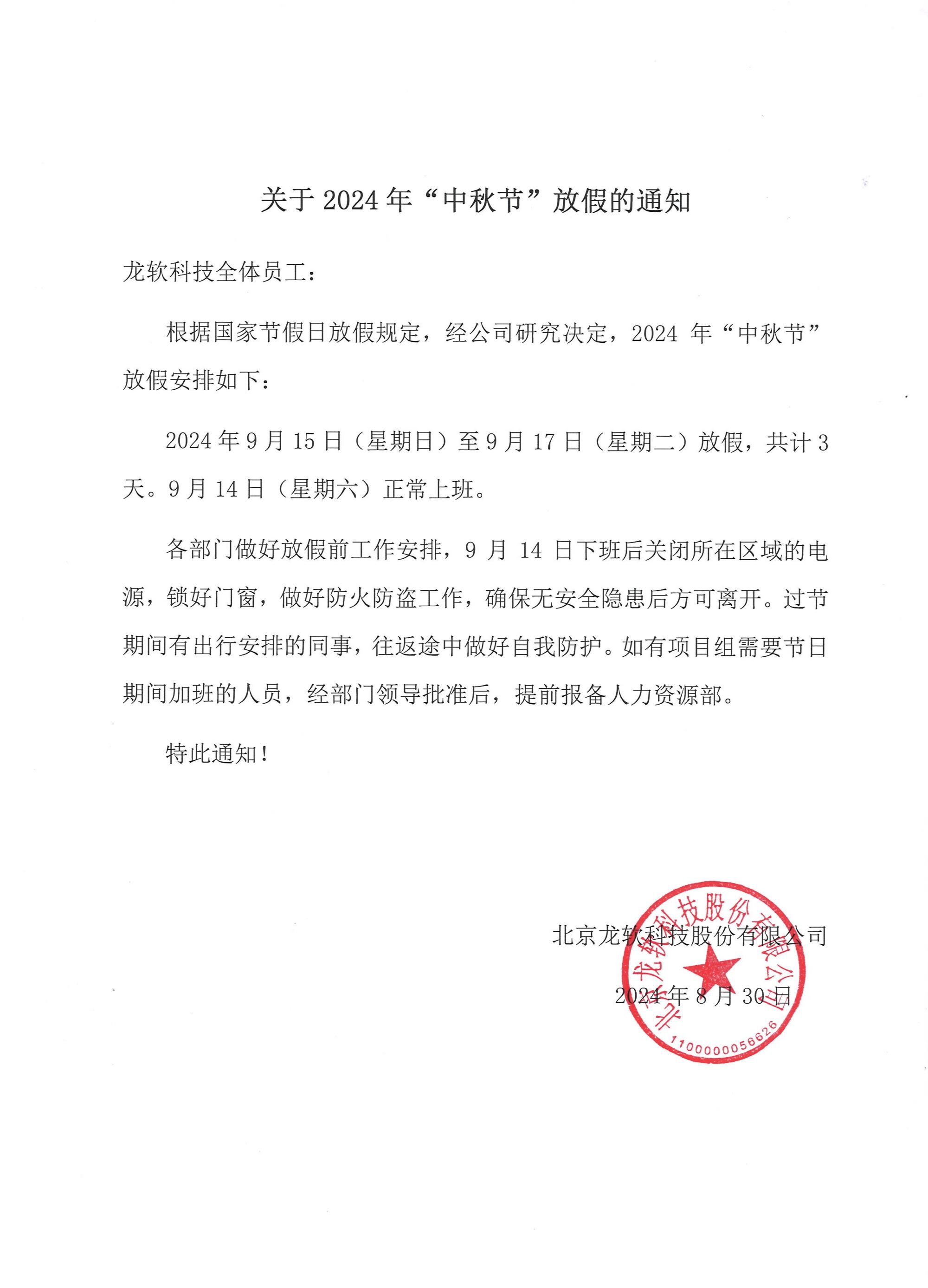 關(guān)于2024年“中秋節(jié)”放假的通知