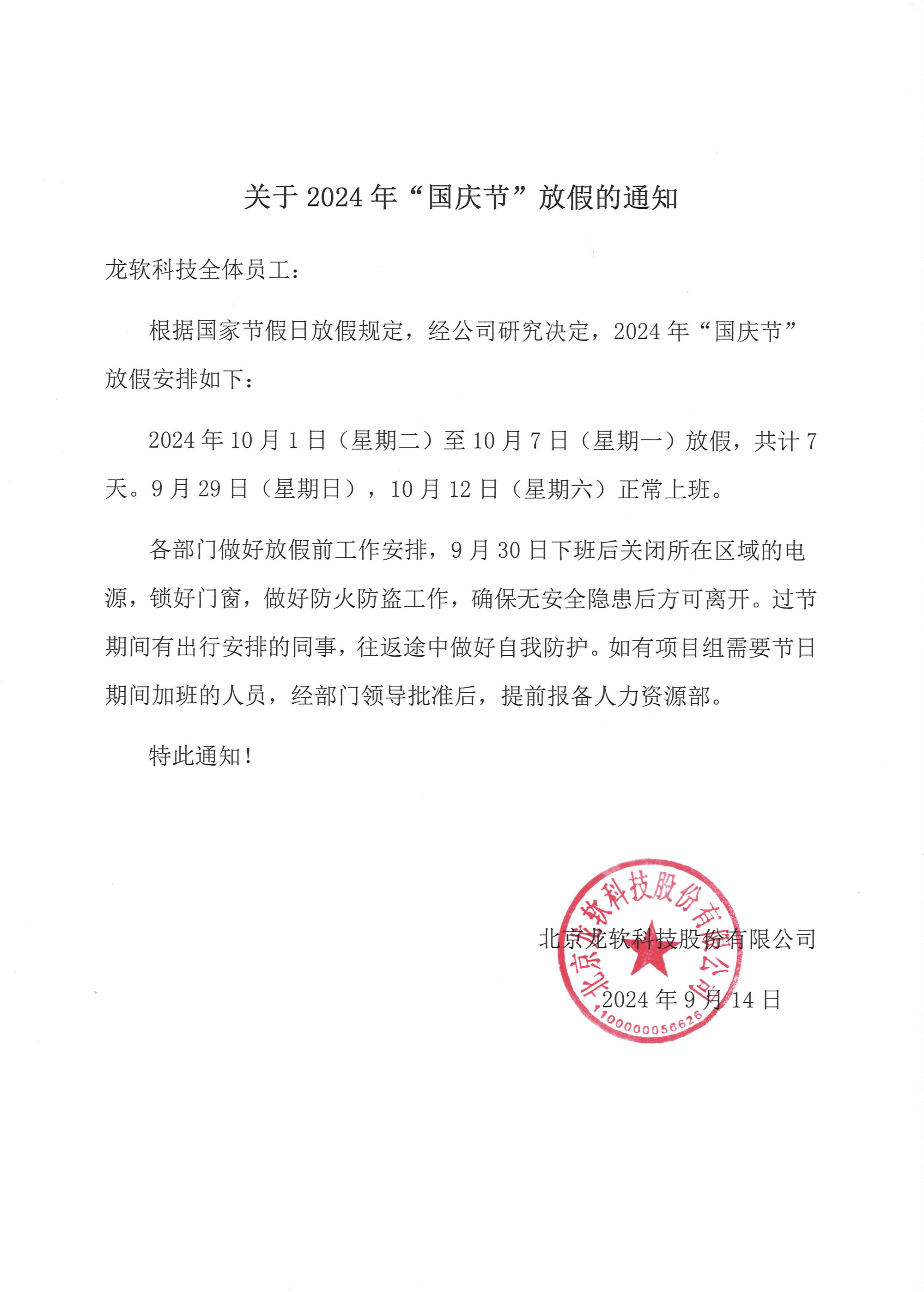 關于2024年“國慶節”放假的通知