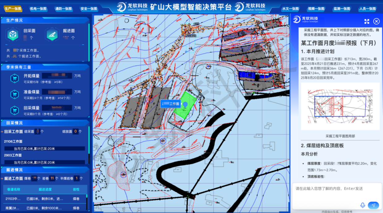 龍軟時空大模型是公司依托多年的AI技術(shù)研發(fā)和礦山行業(yè)應(yīng)用經(jīng)驗(yàn)積累,基于已授權(quán)的數(shù)項(xiàng)發(fā)明專利,融合包括DeepSeek在內(nèi)的先進(jìn)通用大語言模型和自主研發(fā)的時空智能技術(shù),研發(fā)推出的跨越感知、認(rèn)知、執(zhí)行等多維度、多模態(tài)等人工智能技術(shù)體系。該技術(shù)解決了大模型在礦山行業(yè)知識嵌入不足、無法處理矢量時空數(shù)據(jù)等短板,支持接入礦井內(nèi)部各類安全、生產(chǎn)、運(yùn)輸、經(jīng)營等動態(tài)數(shù)據(jù)以及礦井自有技術(shù)資料、專家經(jīng)驗(yàn)等知識,實(shí)現(xiàn)基于時空大模型的智能決策分析系統(tǒng),提供面向礦山各類應(yīng)用場景的視覺智能識別、專業(yè)知識問答、圖形智能處理、業(yè)務(wù)綜合決策等能力,其中視頻AI分析已覆蓋9大類、86小類場景模型,并結(jié)合多智能體封裝管控業(yè)務(wù)流程,實(shí)現(xiàn)礦山生產(chǎn)調(diào)度、安全評價、輔助決策相關(guān)的“智能看圖、智能問數(shù)、智能監(jiān)控、智能分析決策”等應(yīng)用。