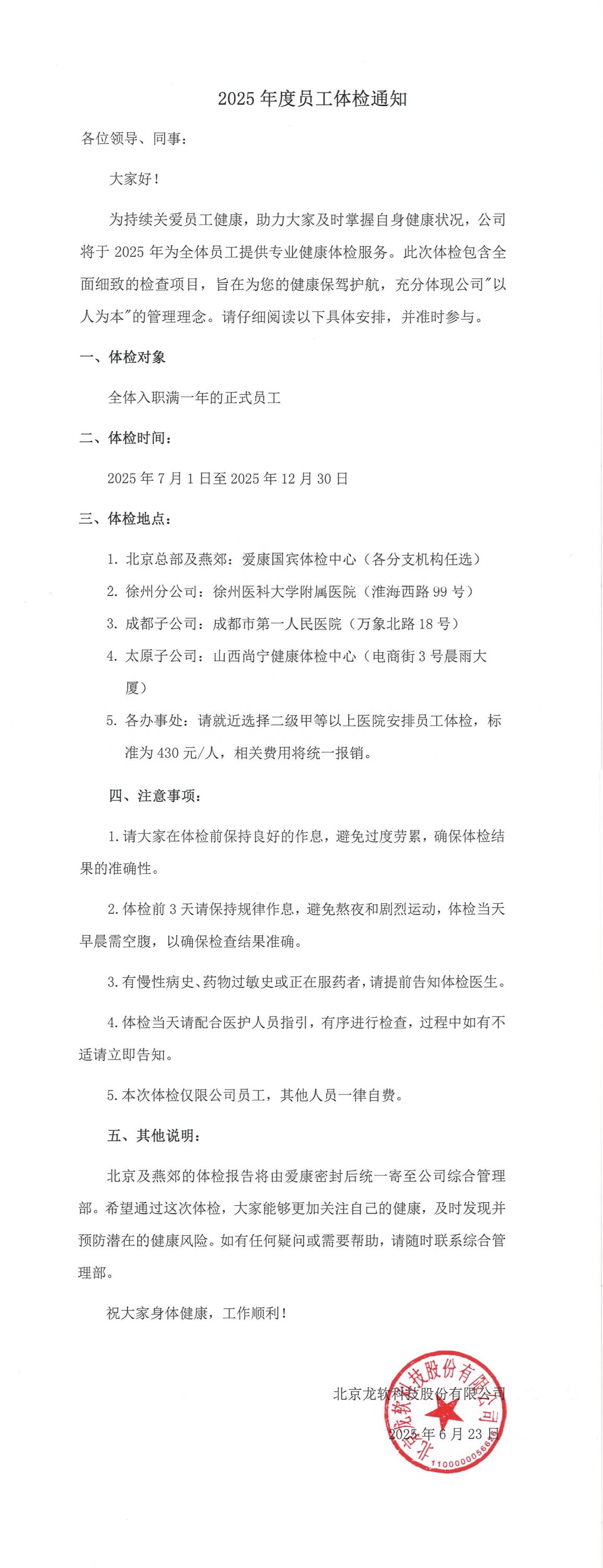 2025年度員工體檢通知