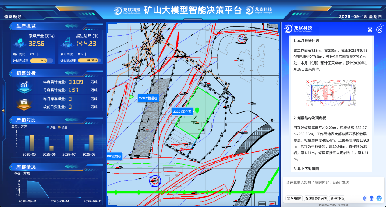 龍軟時空大模型1.0Loong Model 1.0是基于團隊多年在地理信息、時空智能、工業互聯網、大數據等領域的技術積累,研發推出的首個工程領域,特別是礦山工程領域人工時空智能大模型及應用系統。通過自研的矢量圖形大模型、面向視覺的智能分析模型等,以礦山等行業為應用場景,通過知識訓練、私域知識和經驗學習,實現對多源多模態數據的實時分析和深度理解,破解礦山領域矢量處理困難、行業知識融合不足、流程管控復雜等痛點,提供與安全生產全生命周期相關的智能設計、智能問答、智能問數、智能看圖、智能分析決策等應用。最終通過時空感知-精準決策-高效執行的新模式,推動人工智能與礦山領域從淺層結合邁向深度融合,AI從“讀懂文字”升級到“看懂圖形”,從理解語言走向洞察空間,解決了目前大預言模型無法滿足工程領域矢量圖形處理的重大需求。