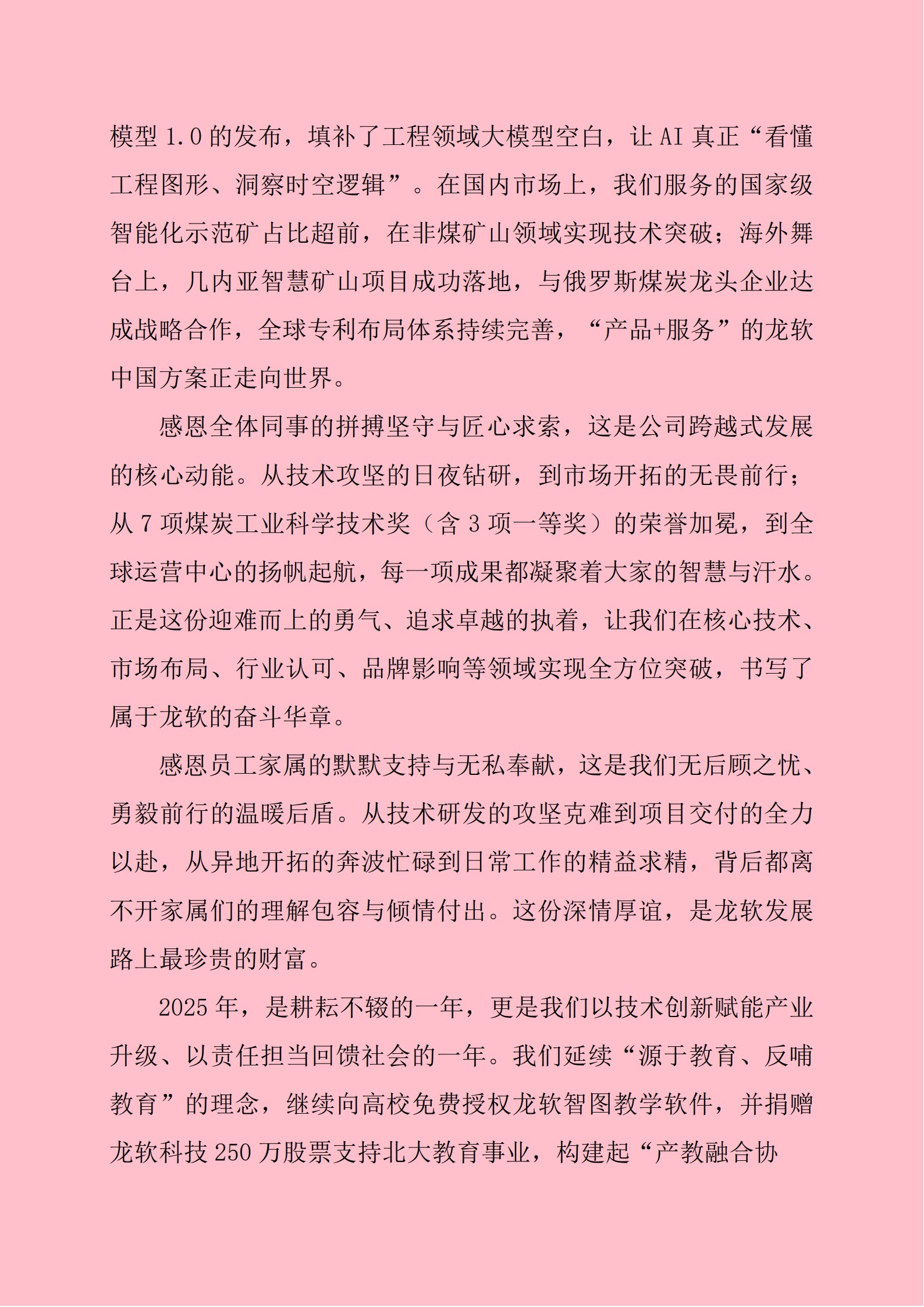 公司持續拓展開放合作邊界,深化與人工智能上下游生態融合,構建面向各類工程垂直領域的大模型技術體系,并設立控股子公司“北京龍軟時空智能科技有限公司”,專注包括礦山在內的泛工程領域智能原創技術研發。同時,與北京大學、北京大學鄂爾多斯能源研究院、內蒙古龍軟北創科技有限公司聯合組建“高級智能化礦井建設研發團隊”,取得了高級智能化礦井建設“6626工程”階段性成果;公司成為中國礦業大學、北京大學和中國煤炭地質總局水文地質局等單位共同建設的“礦區地質與災害超前探測與預警”應急管理部重點實驗室的“礦區三維地質透明化技術示范基地”,為行業提供透明地質建模、礦區透明地質技術、災害探測與預警技術等領域的觀摩學習和技術交流平臺。
