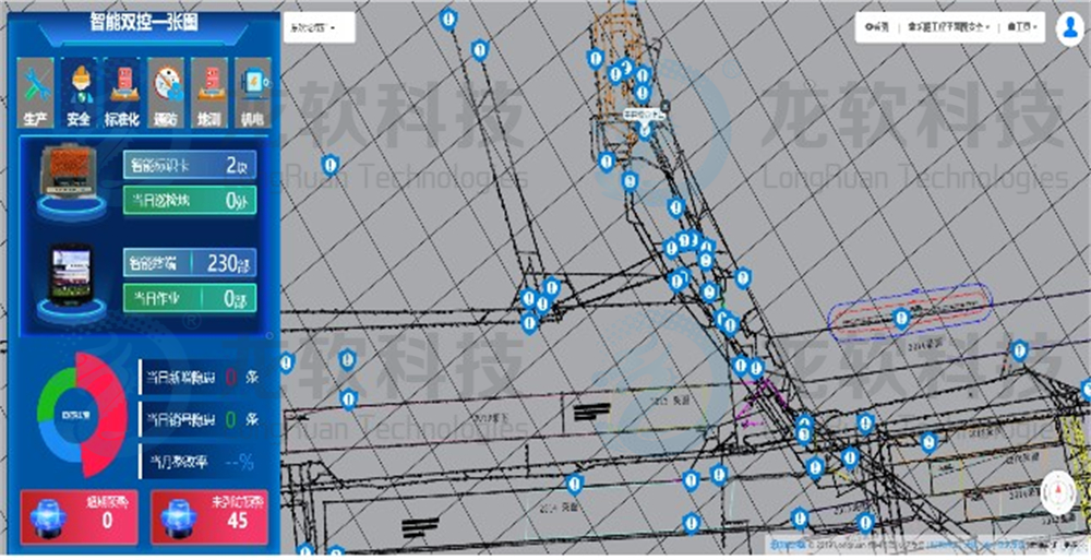 (1)安全雙控一張圖。實(shí)現(xiàn)風(fēng)險(xiǎn)、隱患四色分布,圖中定位展現(xiàn);排查人員軌跡,可查詢、可追溯;報(bào)警提醒,風(fēng)險(xiǎn)點(diǎn)漏檢、隱患超期自動(dòng)報(bào)警;沙盤式管控。