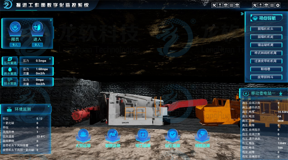 (5)多元信息融合聯動分析功能。實現掘進機及后配套設備的空間位姿、運行信息的融合聯動;具備掘進工作面環境(粉塵、瓦斯、水等)監測數據融合功能,并具備監測環境數據智能分析。